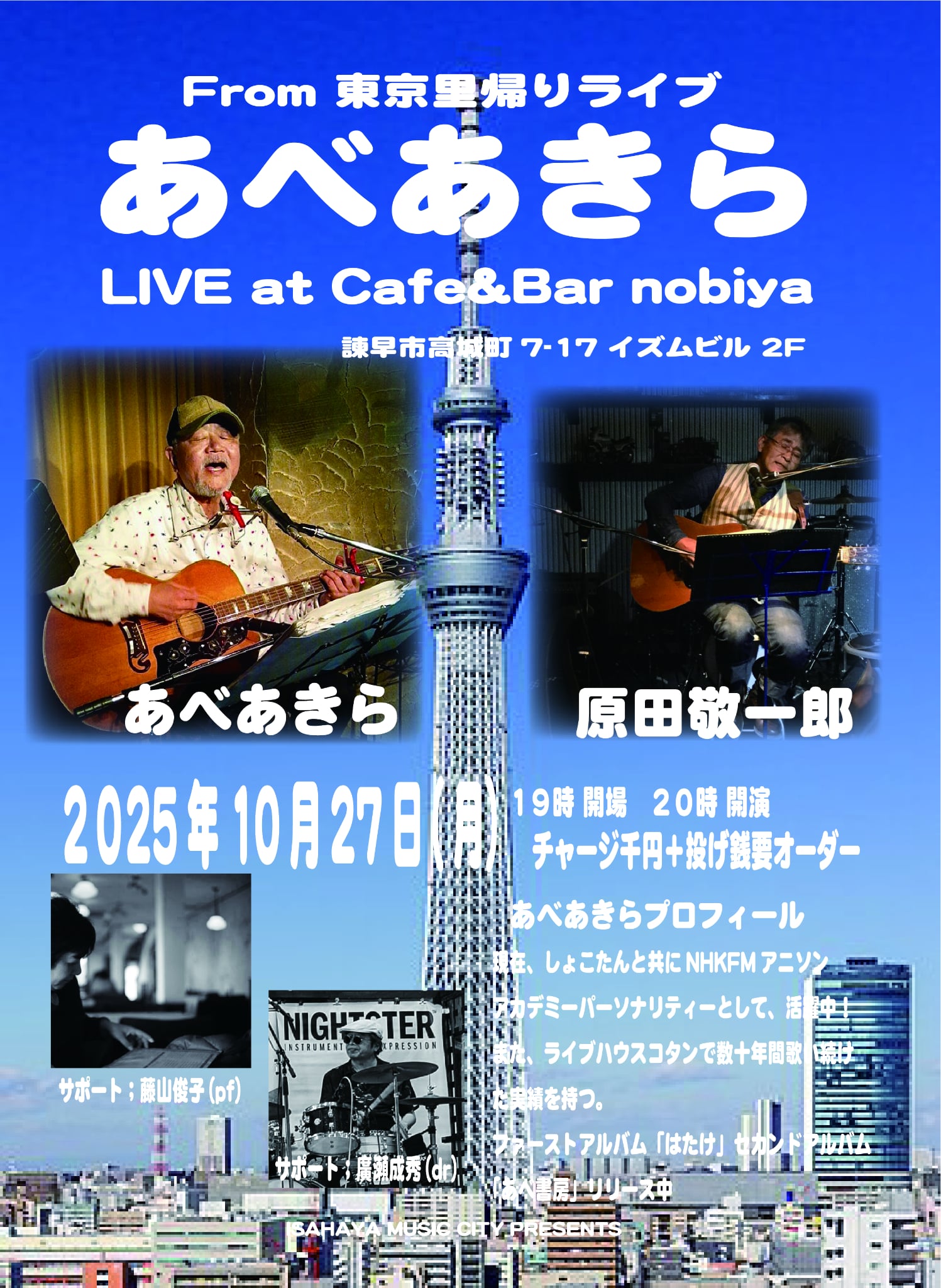 あべあきらライブ@nobiya 長崎県諫早市高城町 オープン:19:00 スタート:20:00